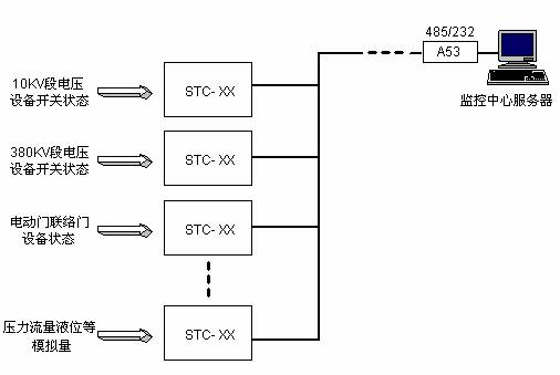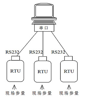 現(xiàn)場(chǎng)每個(gè)RTU通過(guò)485總線設(shè)備相連,共同經(jīng)過(guò)485/232轉(zhuǎn)換器A53連至監(jiān)控服務(wù)器串口。