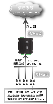 用戶通過(guò)靈活方便的編程環(huán)境,利用騰控可編程協(xié)議技術(shù),將各種協(xié)議轉(zhuǎn)換成標(biāo)準(zhǔn)的Modbus TCP協(xié)議,完成與上位機(jī)統(tǒng)一通信。